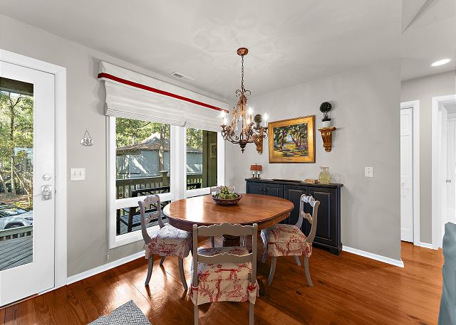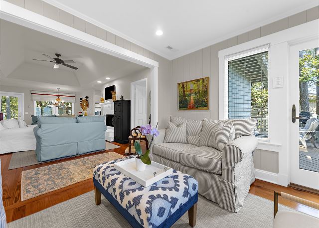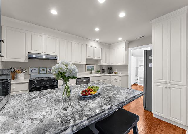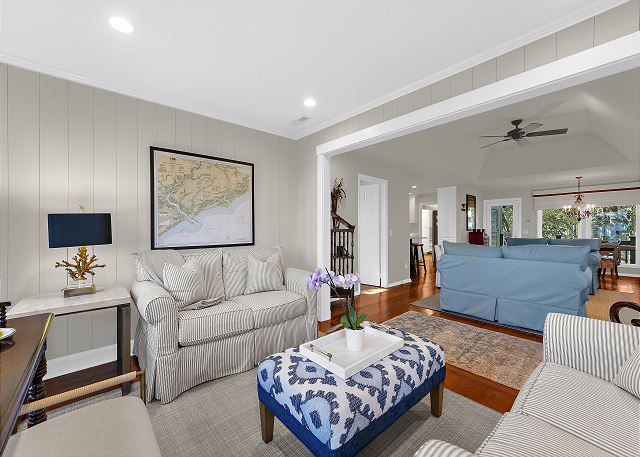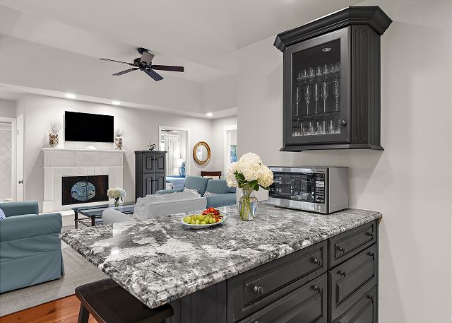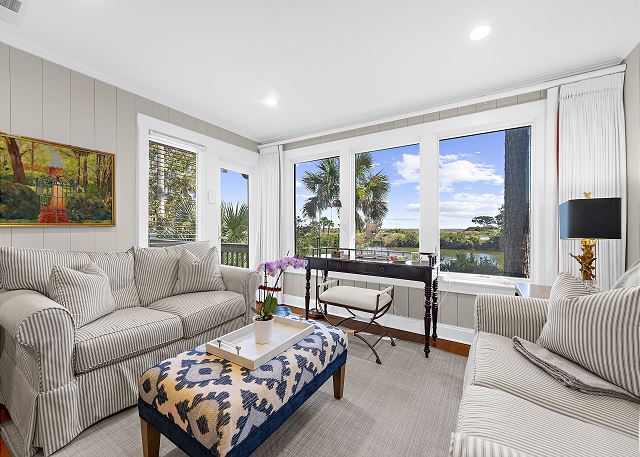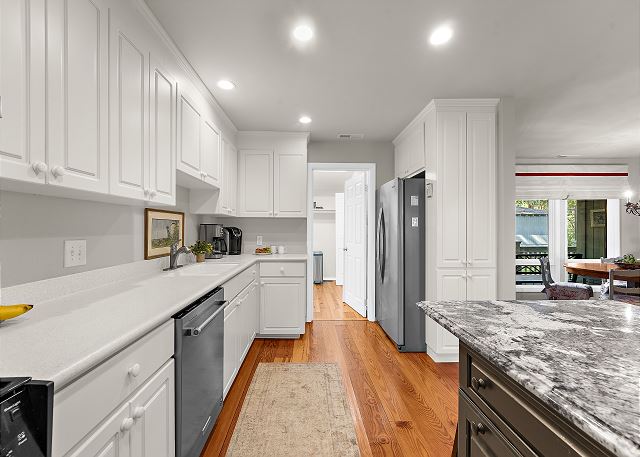 This gorgeous, renovated Sparrow Pond Cottage (1005 Thrasher Ct) was remodeled by Royal Indigo Construction owner Bob Meister. A sunroom was added providing beautiful lagoon and ocean views. All new cabinets for the kitchen island, dining/ living room, bedrooms, bathrooms were provided by Signature kitchen of Charleston. The wooden floors are made of rare, locally sourced (from Kiawah Island), loblolly pine. In short, nothing has been spared to make this charming cottage a special home away from home!