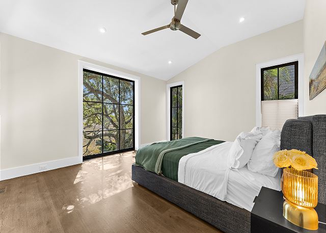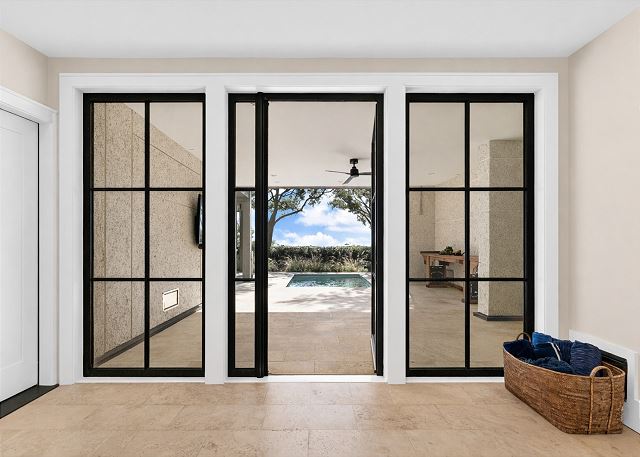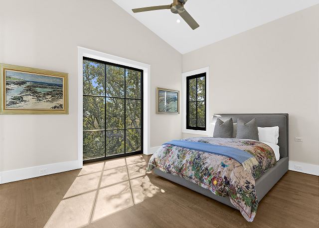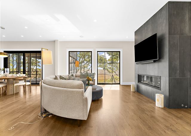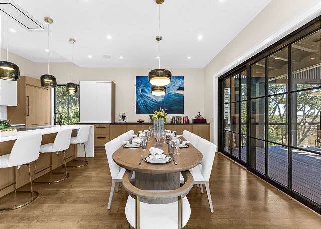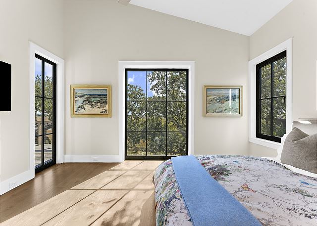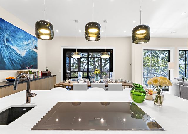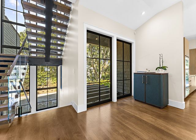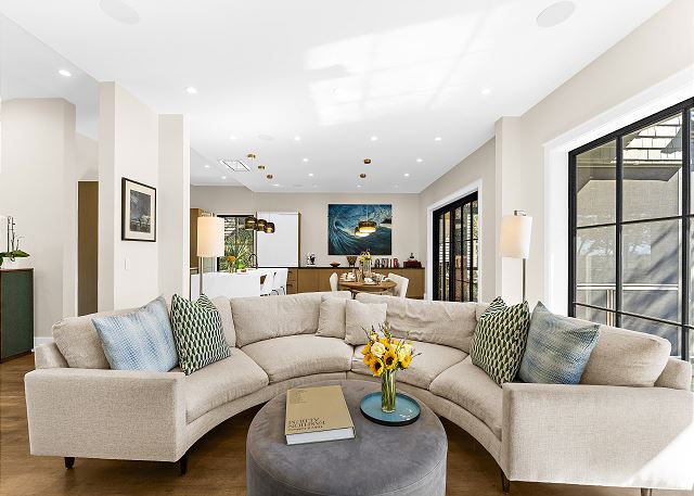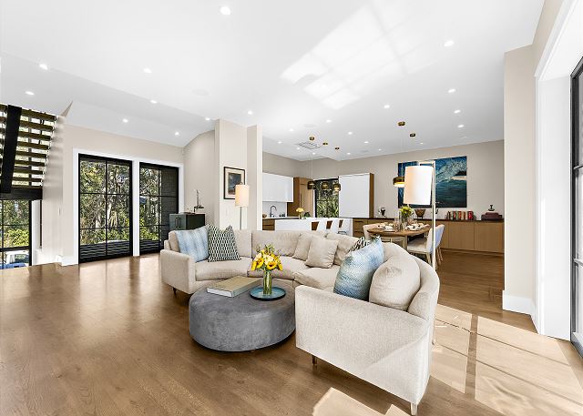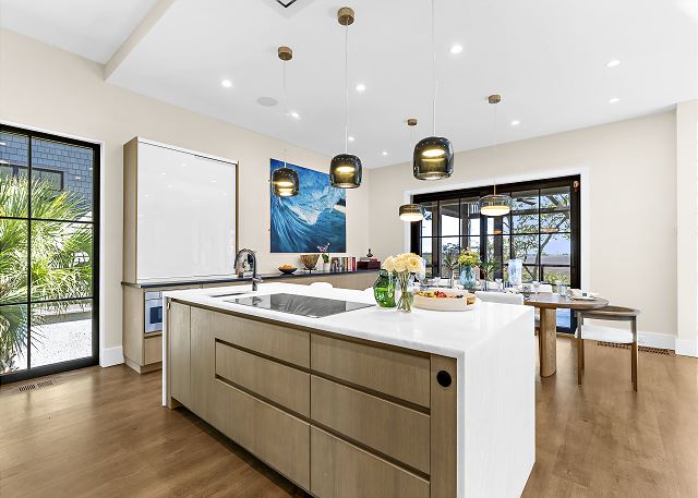 Sun-filled interiors and expansive windows frame beautiful views and create a bright, airy feel throughout. The open-concept living space flows seamlessly for gathering after beach days, while curated finishes and a soft coastal palette keep the atmosphere warm and welcoming.