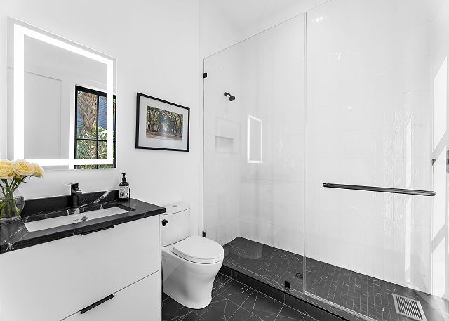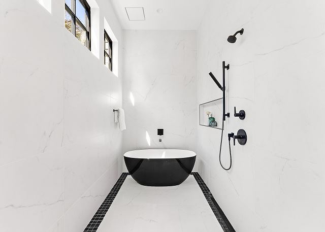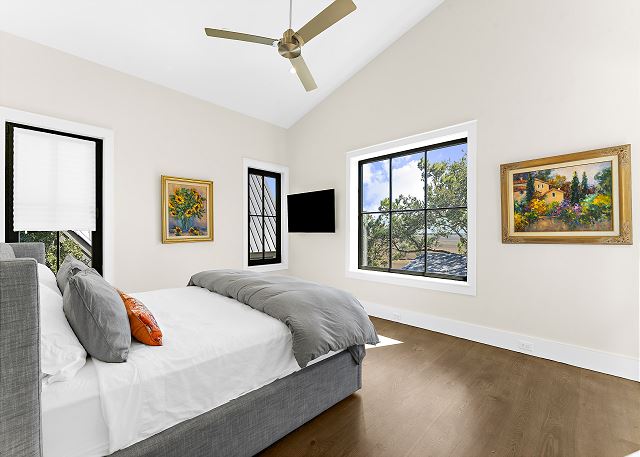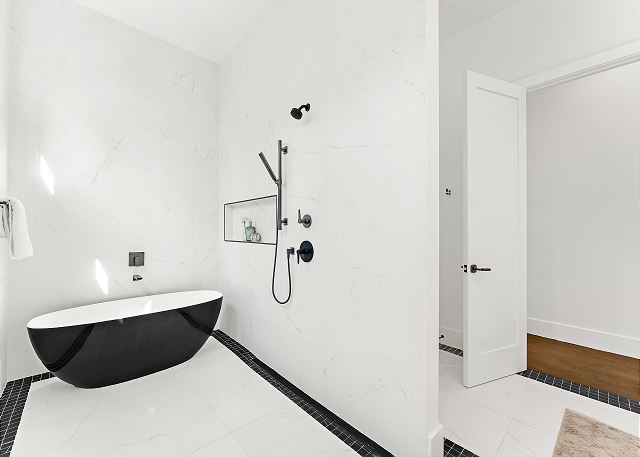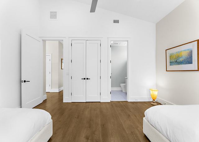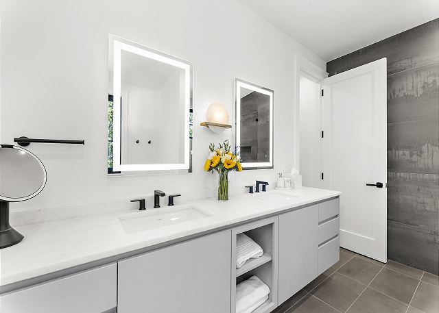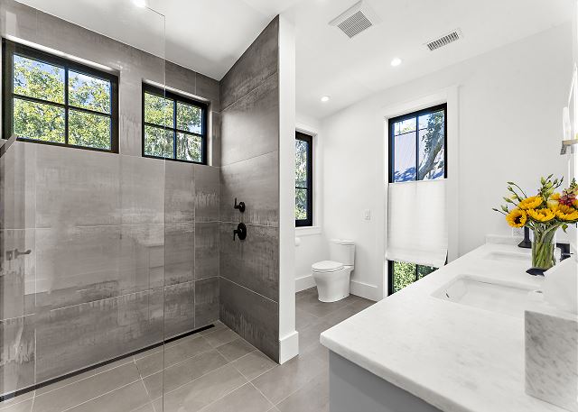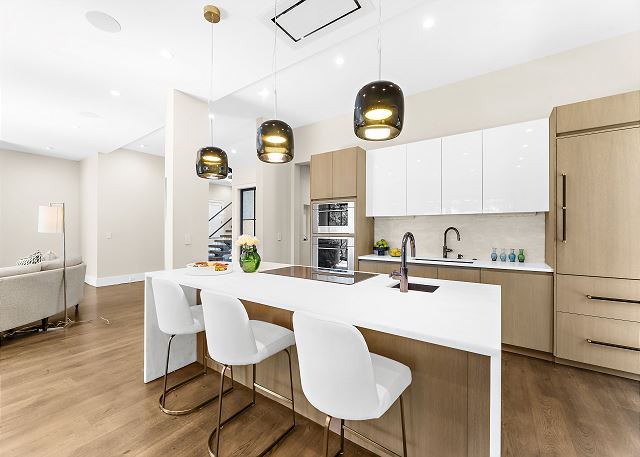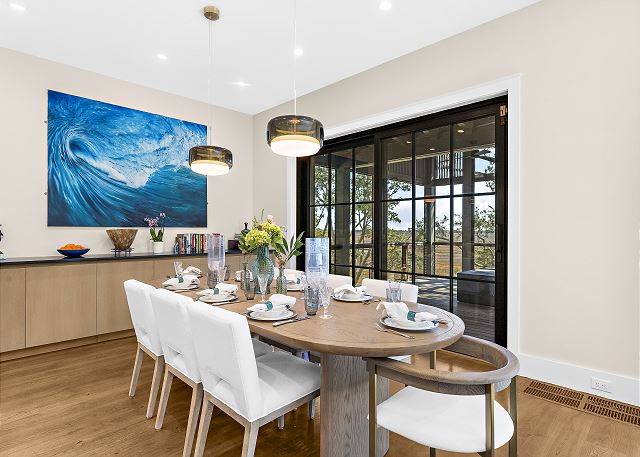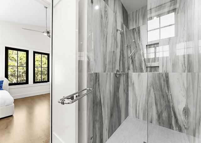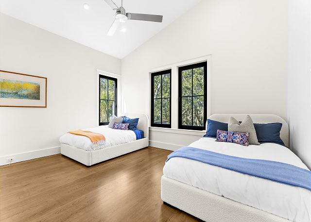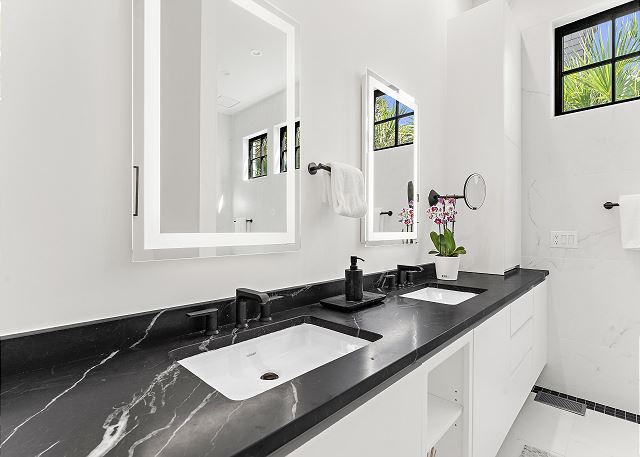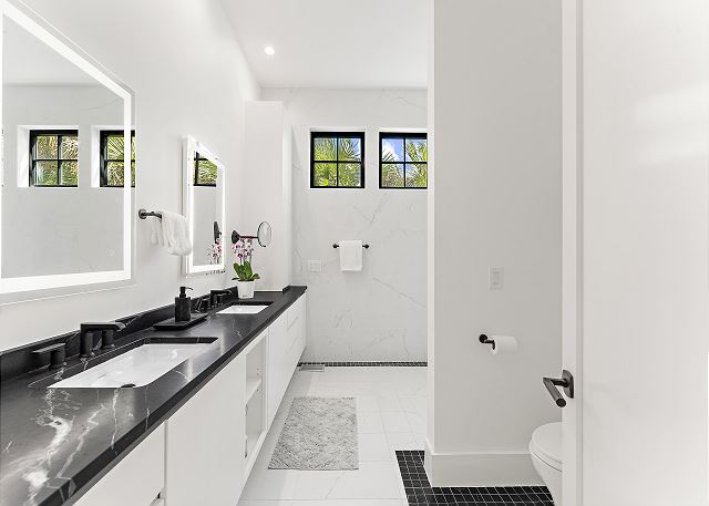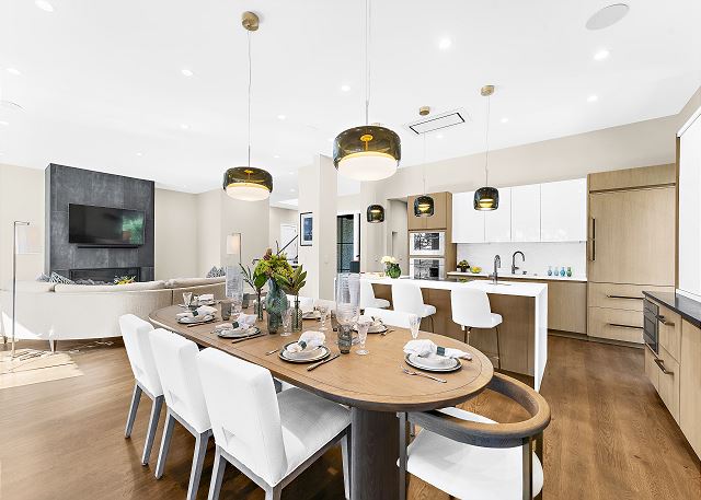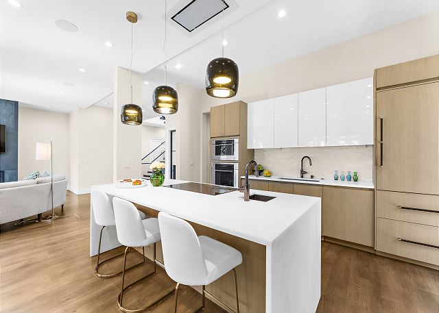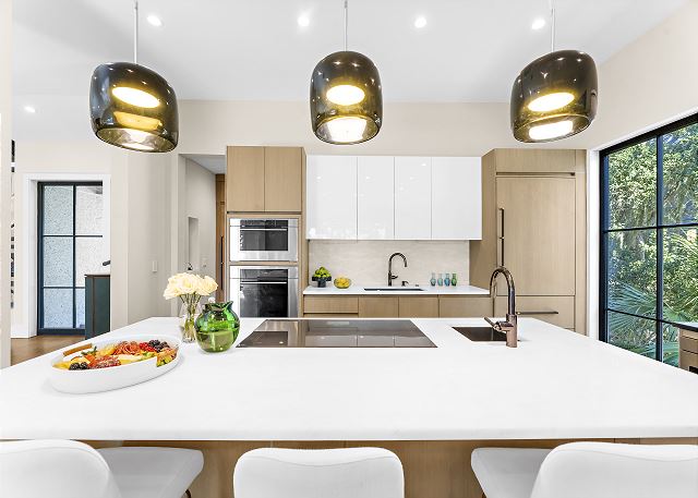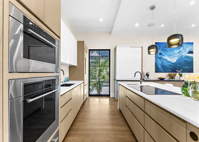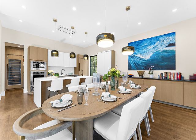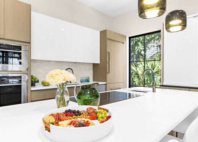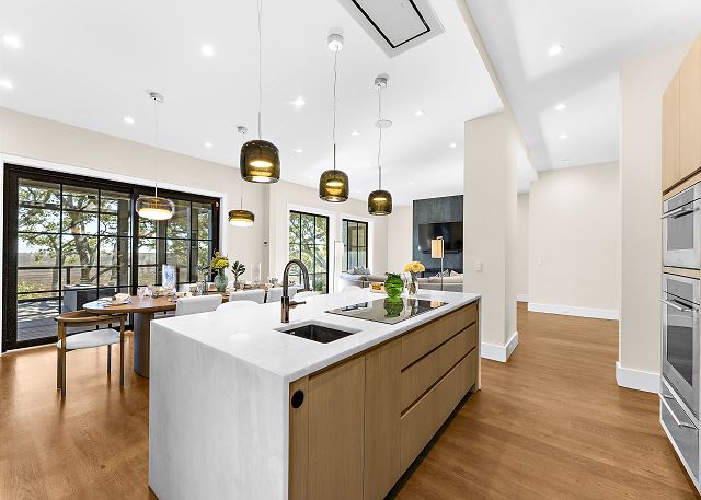 The chef’s kitchen features high-end appliances and a large island ideal for casual meals or evening cocktails. Each of the five spacious bedrooms includes a private en-suite bath with spa-inspired details, and two additional half baths add extra convenience. There are Two master suites with king beds; Two ensuite bedrooms with queen beds and One en-suite bedroom with two double beds.