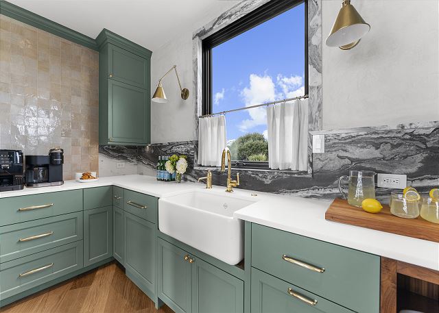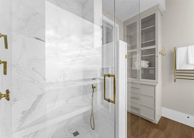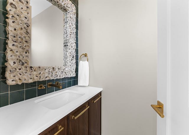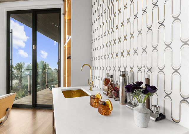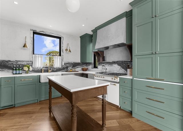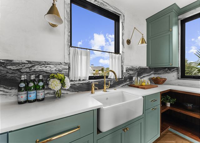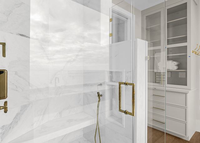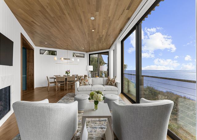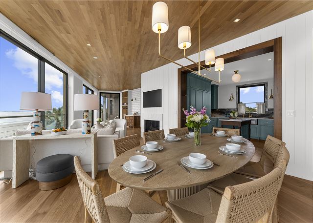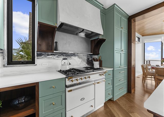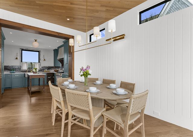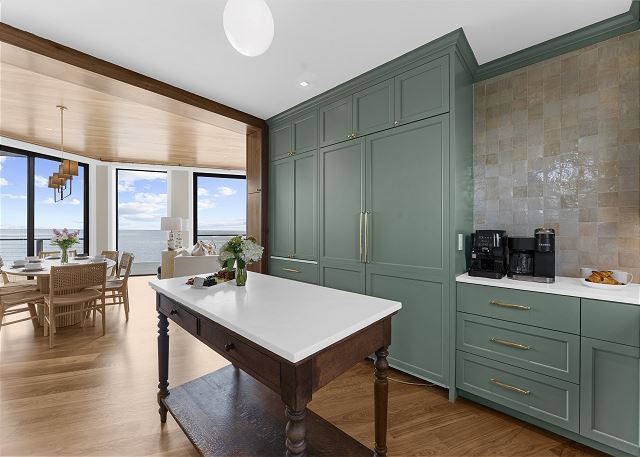 The main floor is made for gathering and entertaining. The kitchen is a beautiful blend of French country charm and coastal elegance, featuring a stunning island and thoughtful details throughout. Just beyond, the dining area offers panoramic beach and ocean views—every meal served with a side of sea breeze.