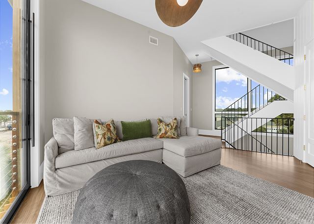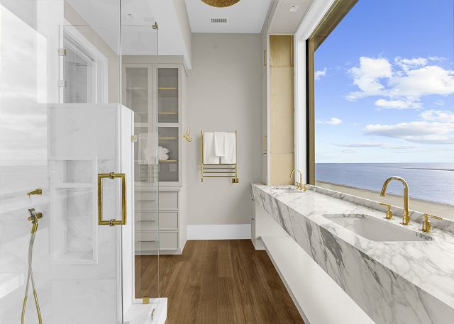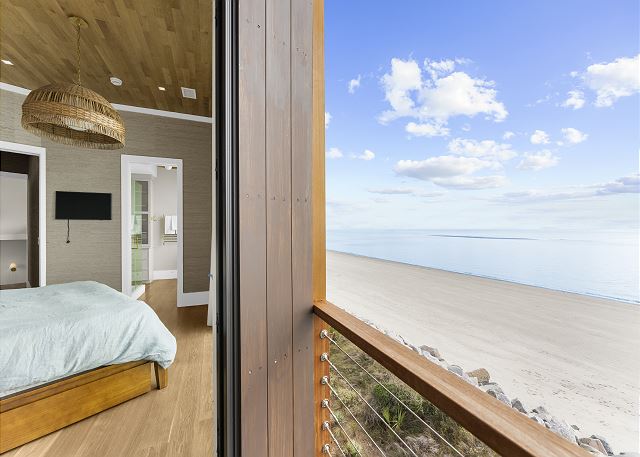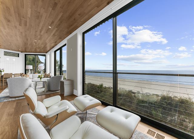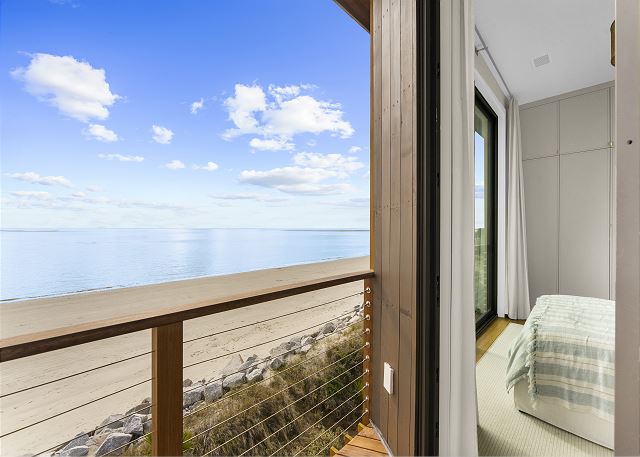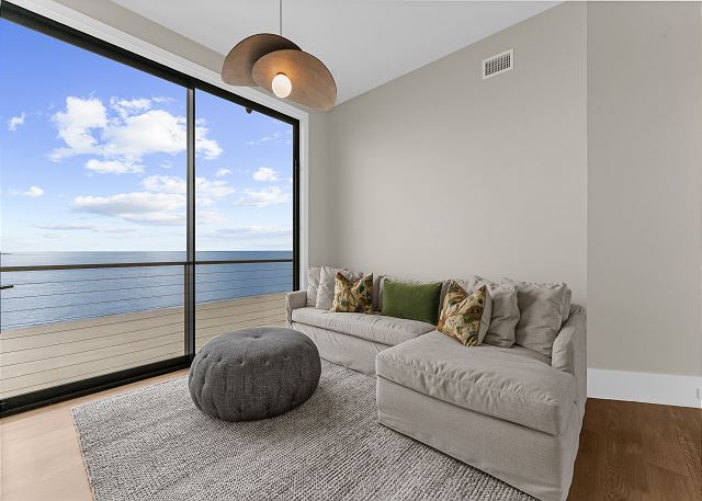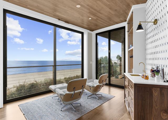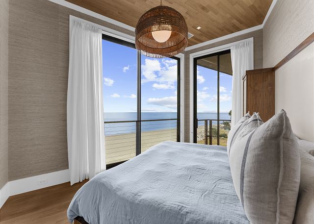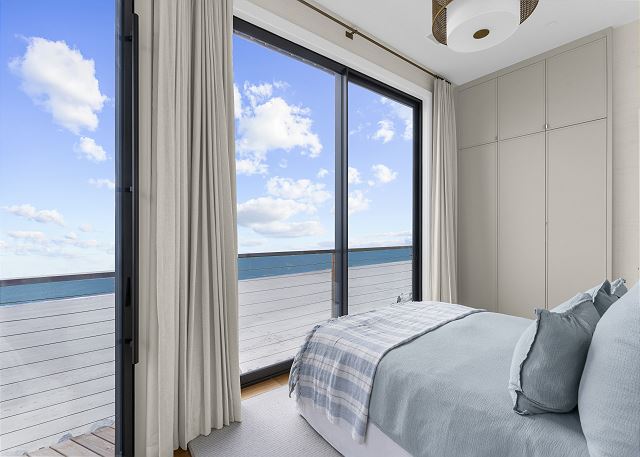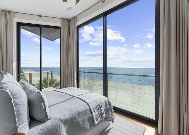 The upper level is designed for rest and reflection. The primary suite is a true showstopper, featuring floor-to-ceiling sliding doors with sweeping ocean views, a cozy private balcony, and a spa-like bathroom where the sink faces the sea—so even brushing your teeth feels luxurious.