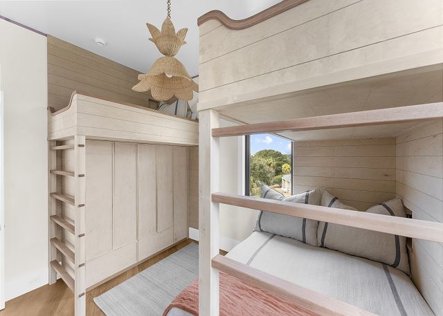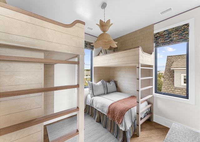 The bedding is thoughtfully laid out for everyone's comfort. The master suite has a comfy king bed, the 2nd bedroom has a queen sized bed, the last bedroom is a bunk set (queen on bottom, xl twin on top) plus a 2nd partial bunk with an xl twin.