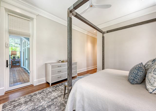 Step outside and you’re greeted by a private oasis. The pool glistens beneath the shade of sprawling live oaks, their leaves whispering in the breeze. Contemporary lounge chairs are perfectly positioned for sunkissed afternoons, while the pool bathroom and outdoor shower make the transition from swim time to relaxation effortless. The screened living space with a mounted TV and cozy seating, becomes the backdrop for unhurried mornings with coffee or late-night stories.