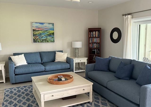 Calming, coastal hues and expansive windows make this charming villa feel open and airy with lots of light. Enjoy stunning golf/lagoon views from the living areas of the property. The living room does have a new queen-sized sofa bed for your extra guests. The sliding glass doors lead you out onto the back deck where you can enjoy your morning coffee or watch the golfers tee-off.