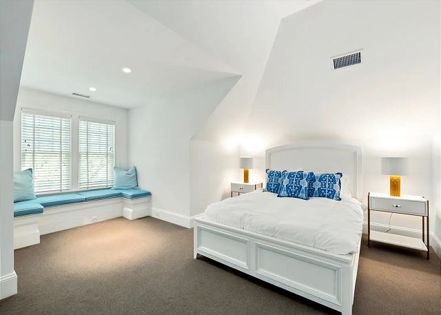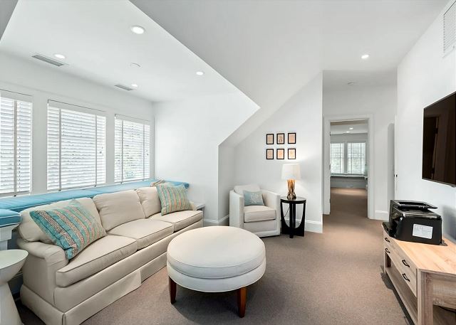 On the third floor, you're greeted with yet another large, additional living space, perfect for cozy movie nights and two additional bedrooms (one with two queens and one with a king) that share a full bathroom.