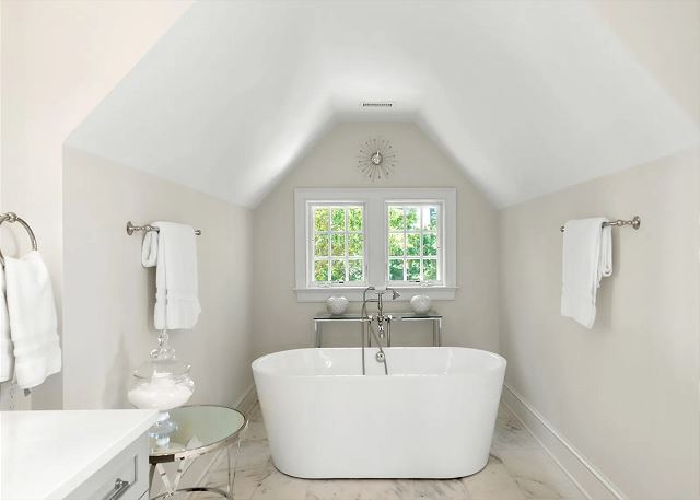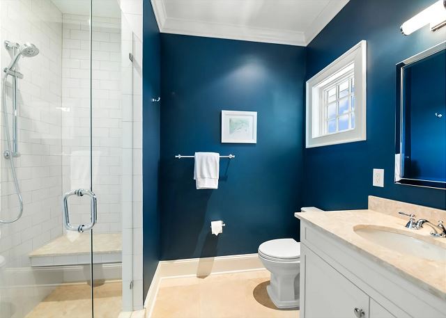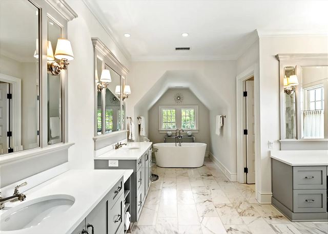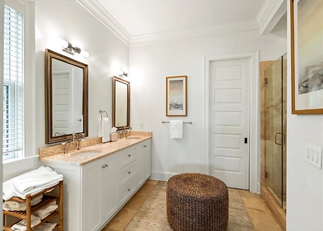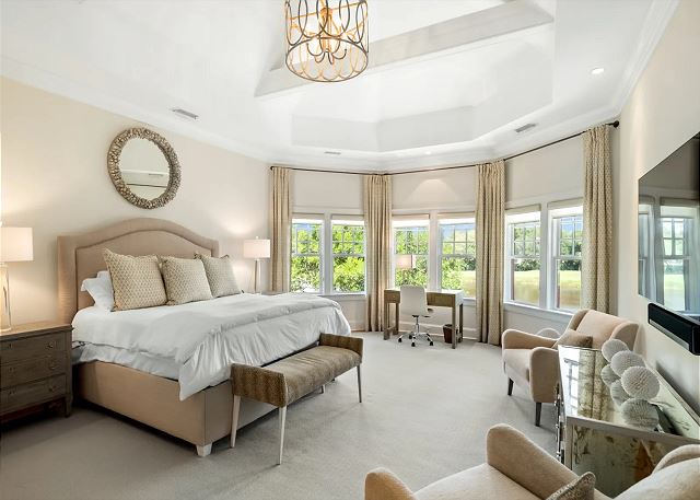 As you journey up to the second floor, you're greeted with a spacious landing area, French doors open to a small balcony, with breathtaking views below. This second level features four bedrooms, two with king beds and two with a queen bed, each with en suite baths and customized closets including a gorgeous primary suite. Your personal oasis has an oversized bedroom with room for seating with a peaked ceiling. A luxurious bath includes two free standing vanities, dressing table, large shower and separate tub. The closet is an organizer's dream and completes the stylish suite.