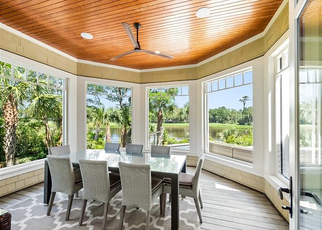 The dining space can seat up to eight and offers even more incredible views of the lagoon and golf course to enjoy. Just through the dining room, you'll find the screened-in porch, with 180-degree views. The incredible outdoor living space includes an expansive rear deck that runs the length of the home with multiple seating and dining areas.