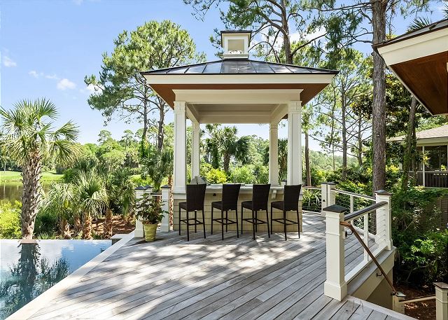 Central to this outdoor retreat is an infinity-edge pool, oriented to maximize views. Additionally, this space hosts a covered outdoor kitchen and bar area with granite countertops, built-in grill, sink, and ample bar seating, all perfectly ideal for entertaining and year-round outdoor dining.