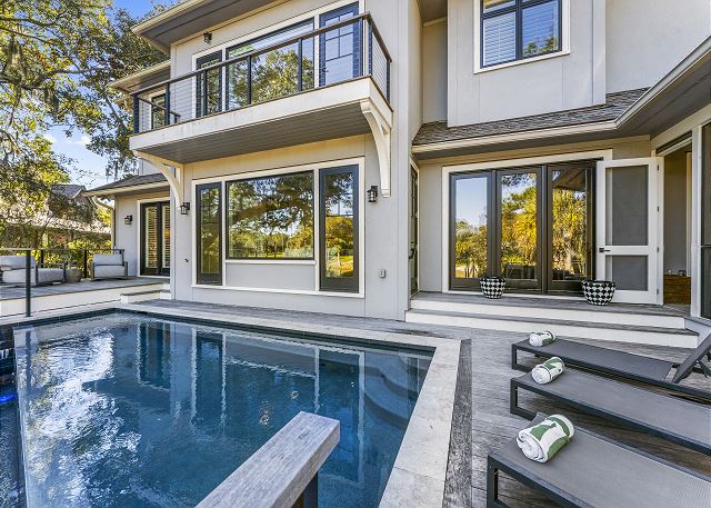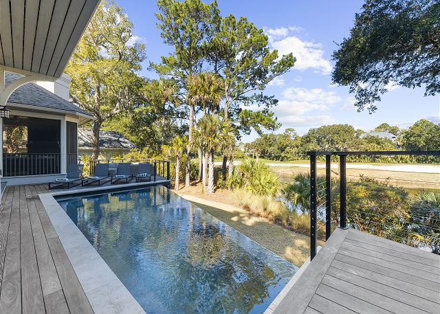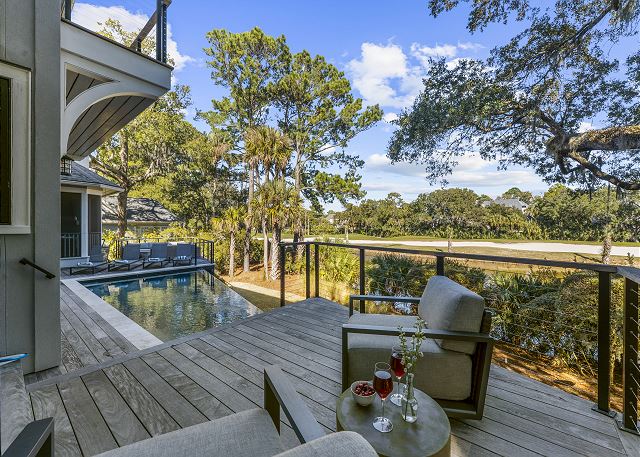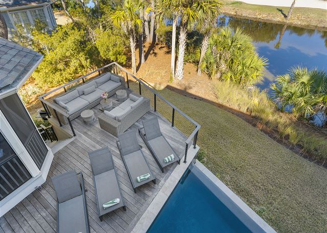 The water and golf views are visible from the moment of entry, as the high-ceilinged foyer opens into the home's two-story living room, streaming with sunlight from three tiers of windows. Glass doors open to a wide sundeck overlooking the water, which provides both privacy from the fairway and wildlife sightings. Relax poolside or enjoy grilling on the deck!