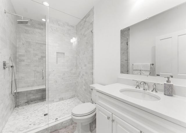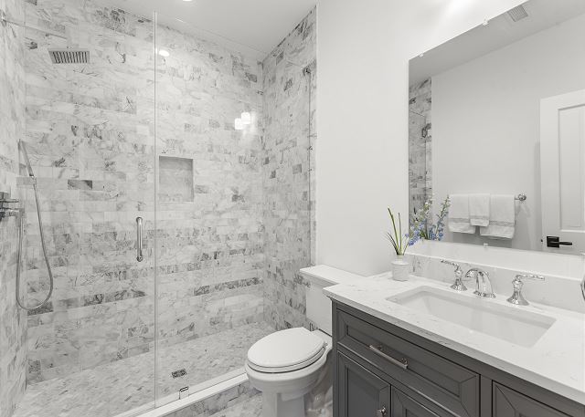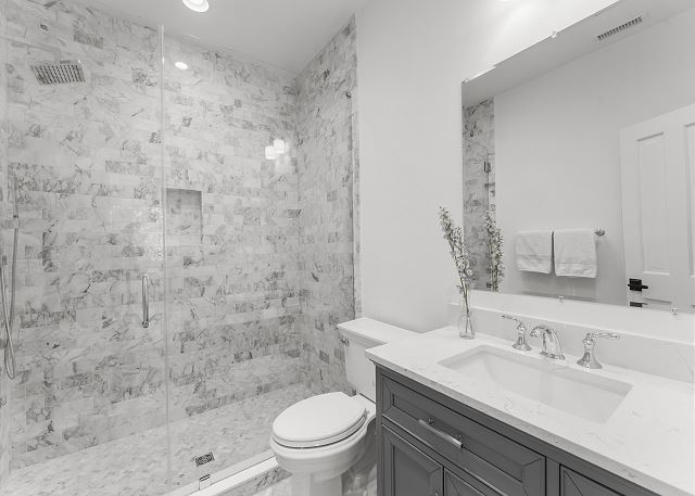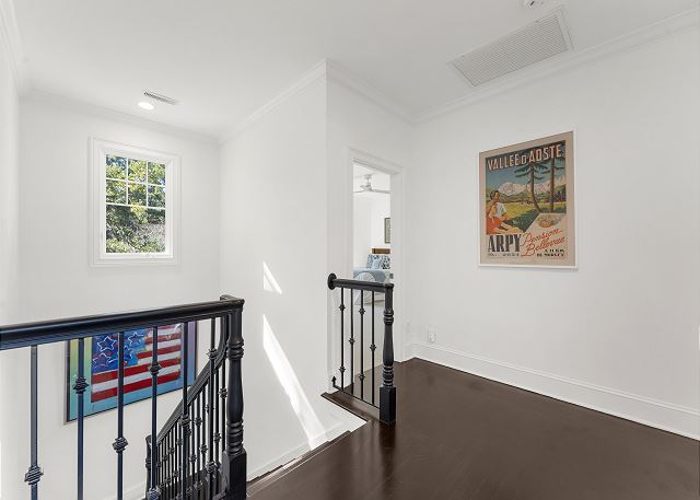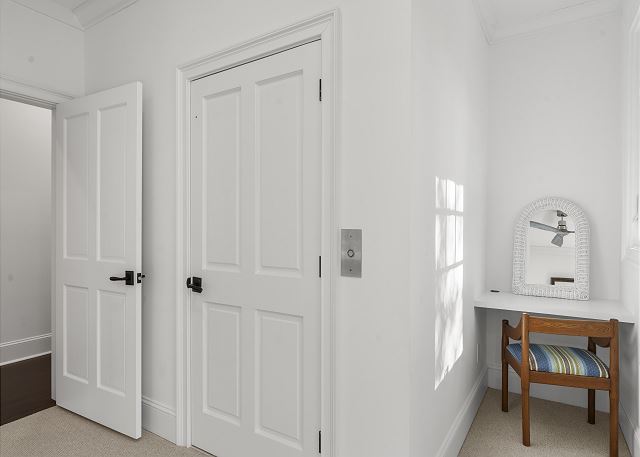 Upstairs is an open loft with a wide arched window, built-in home office nook, and plenty of space for games and entertainment. Three spacious, cream-colored bedrooms with pale wool carpet and white trim offer comfortable sleeping quarters for family and guests, and each bathroom includes a shower with glass doors.