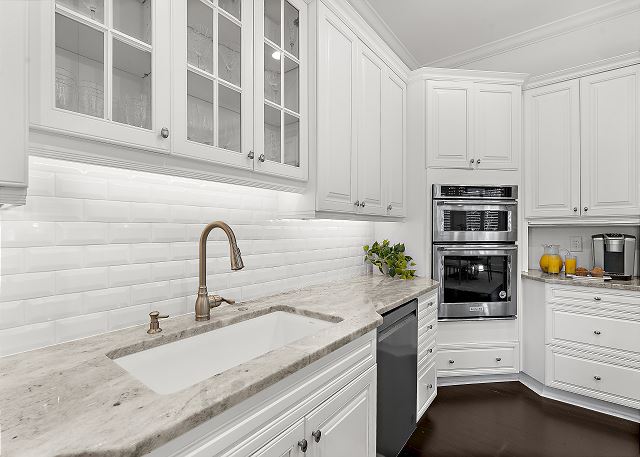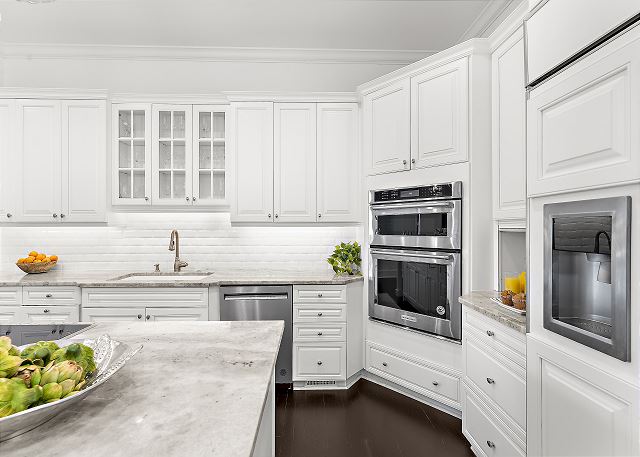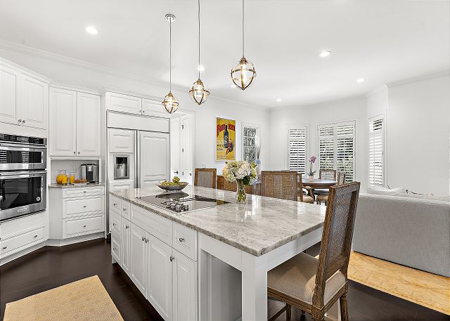 One side of the living room opens to the dining room with its white wainscoting, tray ceiling, and glass doors leading to the sundeck. The adjacent kitchen is spacious, with a center island topped with butcher block and a three-sided breakfast bar open to the sunny breakfast nook. The appliances include a refrigerator and dishwasher paneled to match the cabinetry and a U-Line® wine cooler. A cooktop and prep sink are set into the granite countertops below the breakfast bar, allowing for easy conversation with guests before dinner.