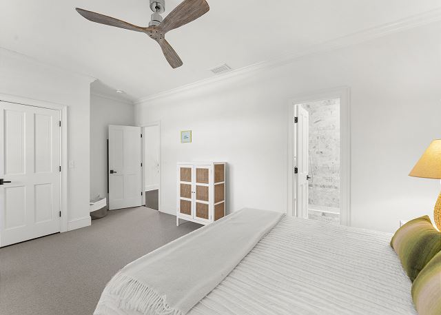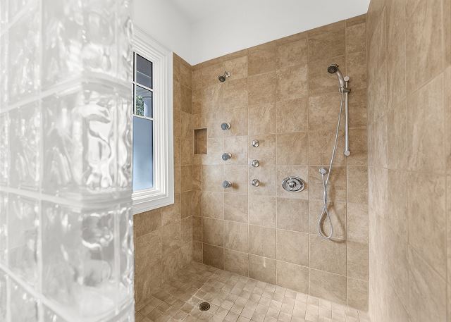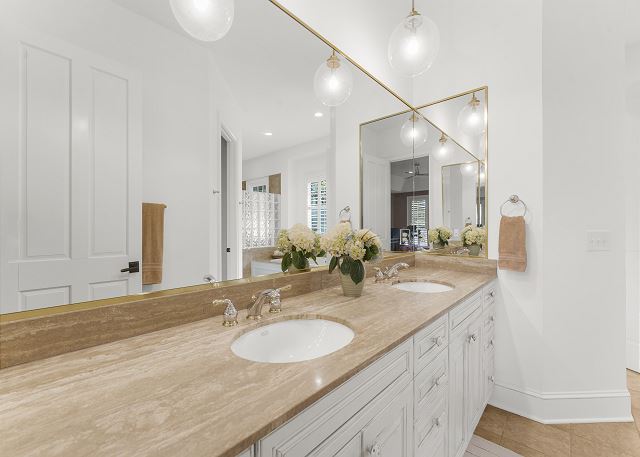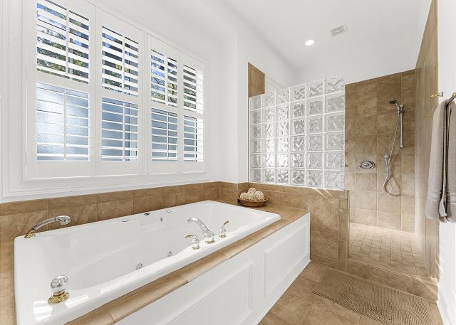 Tucked away on the other side of the living room is the master suite. The bedroom enjoys a tray ceiling and its own access to the sundeck, and the master bath features an expansive walk-in shower, his-and-hers sinks, and a jacuzzi tub below a wide arched window.