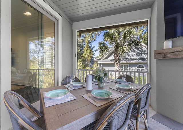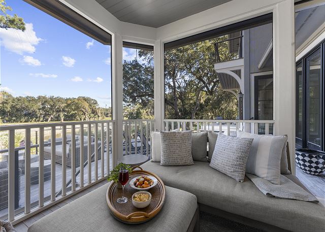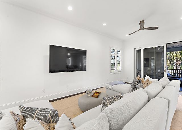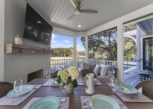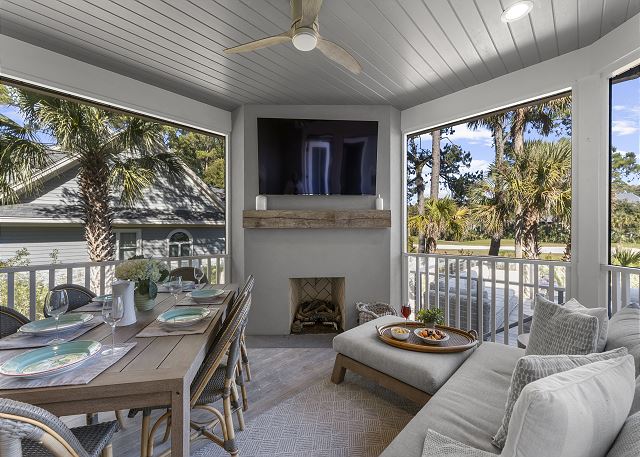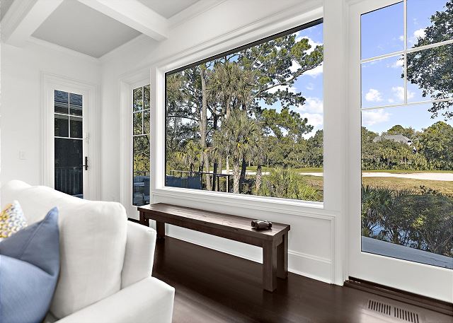 A private family room opens from the kitchen, with a wide glass door leading to the home's hexagonal screened porch overlooking the golf course.